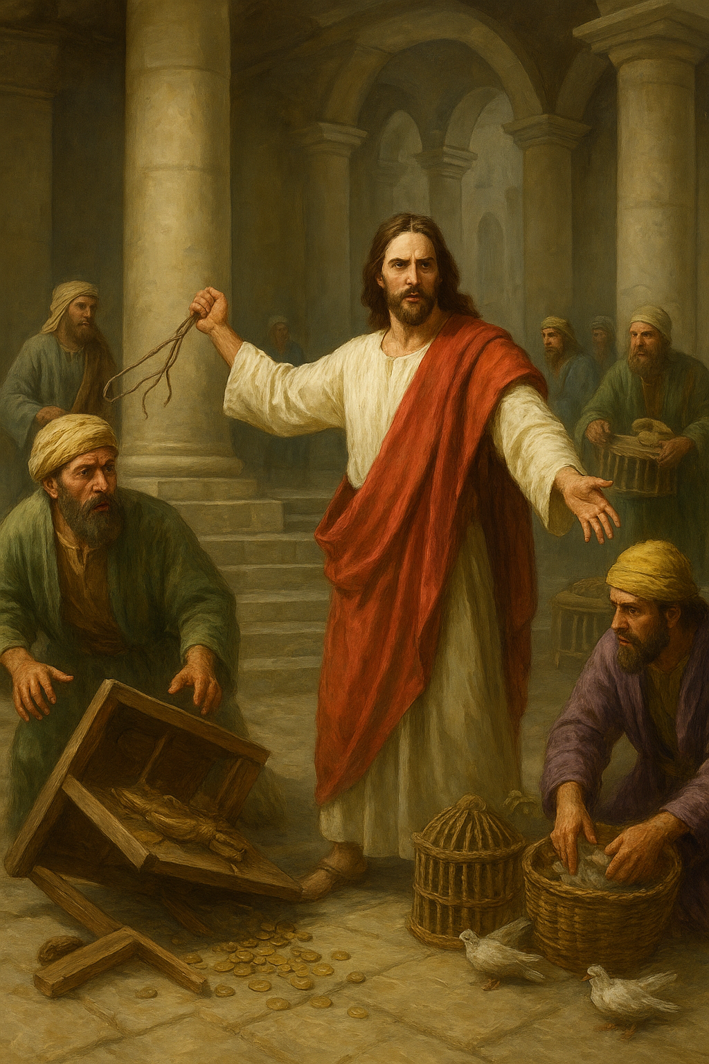 Gdy zbliżała się Pascha żydowska, Jezus udał się do Jerozolimy (J 2, 13-22). I zastał w świątyni sprzedających woły i owce, i gołębie, i siedzących  za stołami bankierów.