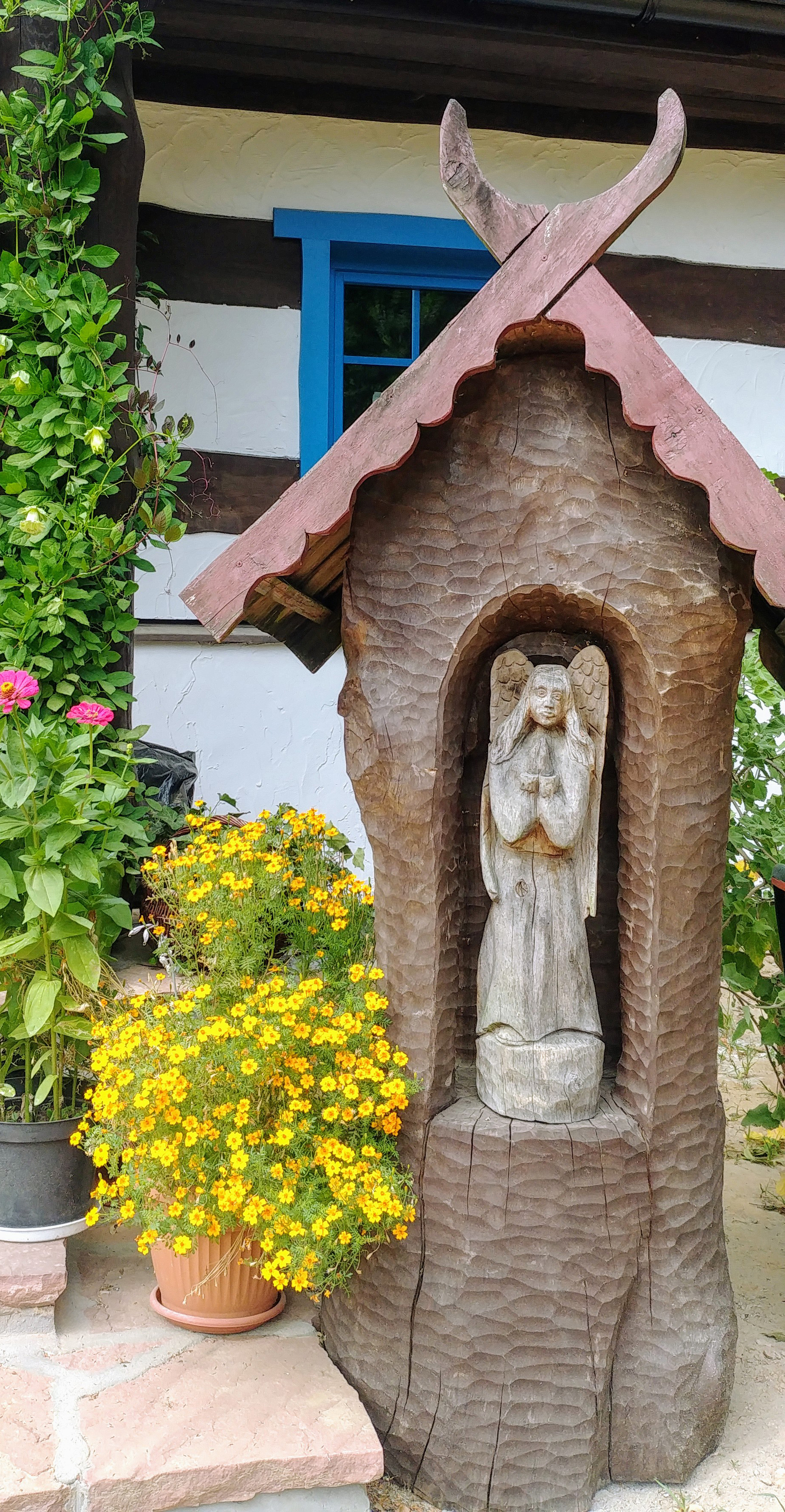 Wszystko to gdzieś głęboko pozostało w pamięci Moniki, bo kiedy umyślili z mężem zagospodarować się na kupionym hektarze pod Lublinem, mieli w wizji domostwo zdobione elementami architektury kurpiowskiej. I powstało ono szybko, nadspodziewanie szybko uwzględniając piętrzące się po drodze trudności, ale o nich tu wspominać nie trzeba. Przed domem stanęła przeniesiona kapliczka michalicka i Monika – skądinąd także historyk sztuki – opowiada o tym w takich oto słowach: „To, że ta kapliczka jest kurpiowska, widać po tzw. śparogach, charakterystycznym elemencie zdobniczym tradycyjnej architektury kurpiowskiej. Są to rzeźbione zakończenia wiatrownic (desek krawędziowych dachu), które krzyżują się na szczycie chałupy, a tutaj na szczycie kapliczki. Ja odważnie pomalowałam je na niebiesko, bo to kolor stolarki okiennej naszego dworku, ale żywe kolory niejednokrotnie widziałam w obramowaniach okien, rzeźbionych opaskach i okiennicach chat kurpiowskich. To stąd właśnie ta moja odwaga do kolorowych okien dworku. Początkowo chcieliśmy z mężem nawet budować i odtwarzać tutaj prawdziwy drewniany dom kurpiowski, bo są firmy, które zajmują się rekonstrukcją drewnianej architektury regionalnej. Okazało się jednak szybko, że – paradoksalnie – łatwiej dziś zbudować dworek niż odtworzyć wiernie drewnianą kurpiowską chatę z właściwą jej misterną i „koronkową” momentami stolarką. Tata wiedział, że od czasu swej pracy magisterskiej (Anioły Juliusza Słowackiego) i doktoratu (Aniołowie w poezji Adama Mickiewicza) mam szczególne nabożeństwo do aniołów, z których Michał jest największy. Dzięki ojcowskiej miłości i zrozumieniu moich ciągot do świata anielskiego, zostałam wyróżniona osobistą, unikalną kapliczką. Samą kapliczkę rzeźbiarz robił w ogrodzie u rodziców, bo pień drewna był zbyt ciężki na wielokrotny transport. A figurę Michała Archanioła wystrugał u siebie. Pytałam ostatnio mamę, czy zna może tego rzeźbiarza albo kojarzy choć nazwisko, ale te fakty mój tata zabrał ze sobą do grobu. Kapliczka od wiosny 2018 stała w ogrodzie u rodziców, bo jakże ją zabrać do Warszawy. Ale jak tylko powstał nasz mały dworek w Piotrowicach [pod Nałęczowem], tak od razu poprosiłam o transport mego brata, który przywiózł ją pod nasz dom. Kapliczka została poświęcona przez zaprzyjaźnionego księdza Tomasza Kościka i głęboko wierzę, że Michał Archanioł dzień i noc strzeże nasze siedlisko. Obecność tejże kapliczki przed domem nie jest dla nas zatem tylko dekoracyjnym ornamentem”.
